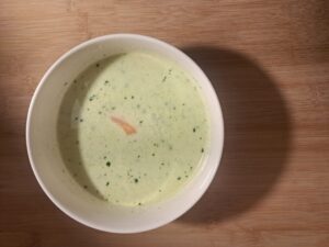 Ingrediënten (voor 2 personen) 1 courgette, 1 teen knoflook, 1 kleine ui, 500 ml water + 1 groentebouillon blokje, 50 ml slagroom of 1 el crème fraîche, 50-75 g gerookte zalm, peper en zout naar smaak. Snij de courgette, knoflook en ui fijn. Doe wat olie in de pan, bak hierin de ui en knoflook glazig en voeg de courgette toe. Giet hier het water en bouillonblokje bij. Laat dit een tijdje koken. Pureer het geheel. Serveer de soep met een klein scheutje slagroom en wat snippers gerookte zalm.