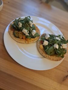 Pita broodjes met voorgesneden zomergroenten, provinciale kruiden, hummus (naar keuze), olijfolie, fetakaas, rucola, zout en peper. Pita broodje in de oven (aantal minuten en temperatuur staan op de verpakking), groentjes samen met de kruiden opbakken in de olijfolie. Als het broodje klaar is en de groentjes lekker bruin zijn, ben je al bijna klaar! Eerst nog even een lekkere, dikke laag hummus op het broodje, groentjes erop en maak het af met de verkruimelde feta, wat rucola en misschien nog een klein snuffie zout en peper en/of een sprinkeltje olijfolie eroverheen voor de smaak en smullen maar! Mocht je een grote eter zijn dan kun je altijd nog rijst en/of zoete aardappelfrietjes erbij voegen.
