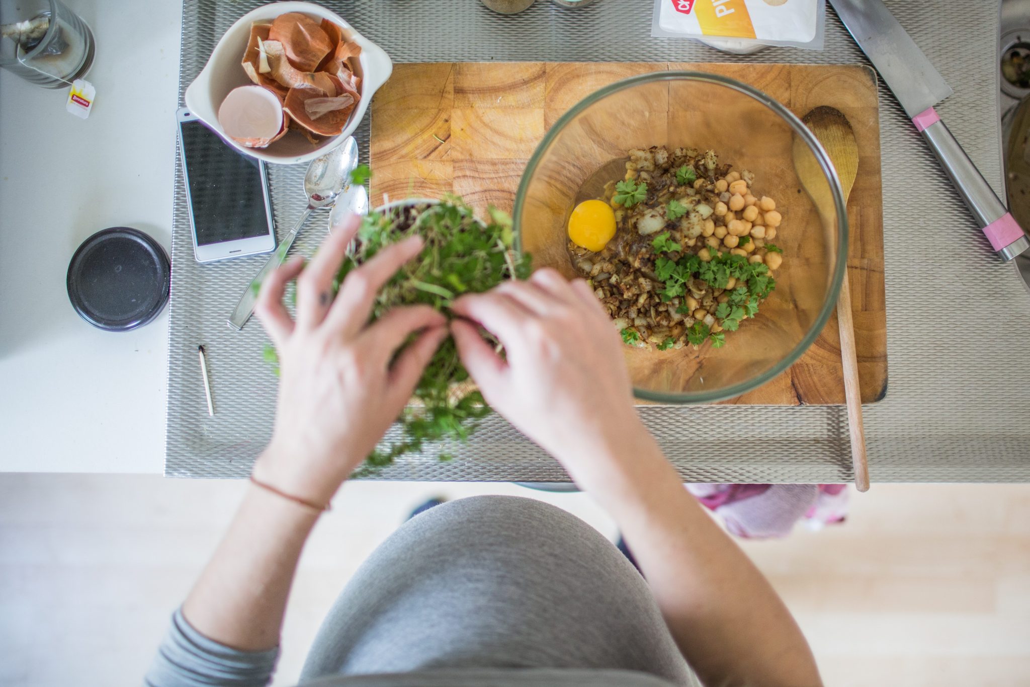 Doe de kikkererwten samen met je ui-knoflook-kruidenmengsel, het ei en de peterselie in een keukenmachine en meng het flink door mekaar. Mocht je geen keukenmachine hebben: dan in een kom en met de staafmixer aan de gang. Gaat ook prima.